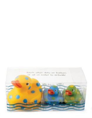 This cute little ducky family is the perfect gift for a new baby or just fun to add to your bathroom decor. The Daddy Duck measures 3-3/4 L x 3 H x 3-1/4 W. The babies measure 2 L x 2 H x 2-1/4 W. Ducks have sensors on the bottom and will activate by touch or by floating in water.